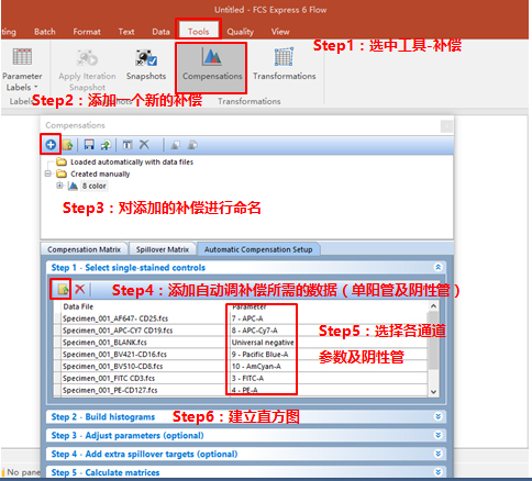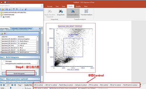 依次調(diào)整好各單管Control的Marker門的位置。此處不一一列舉。回到補償界面。此處的3、4適用于使用補償beads調(diào)節(jié)補償?shù)那闆r(由于本次數(shù)據(jù)為細(xì)胞,此處不詳細(xì)列出,如對此步驟感興趣,可咨詢小達君)
