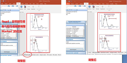 圈好門之后,選中單管Control版面,按照陰性細(xì)胞與陽性細(xì)胞的位置調(diào)整Marker門的位置。