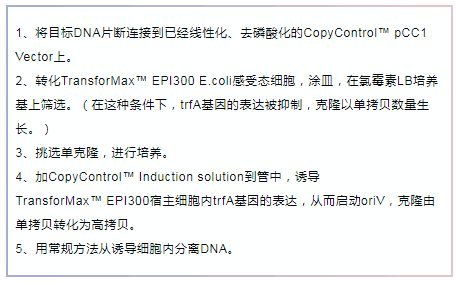 pCC1和pCC2載體含有兩個(gè)復(fù)制起始位點(diǎn):單拷貝的大腸桿菌F-因子復(fù)制子和誘導(dǎo)型的高拷貝oriV。其中OriV的啟動,需要trfA基因產(chǎn)物,由CopyControl?的另一個(gè)重要成分——TransforMax? EPI300 E.coli菌株提供。