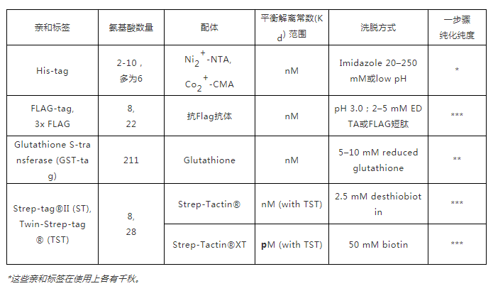 首先,需考慮選擇合適的親和標(biāo)簽。常用于哺乳動物表達系統(tǒng)的親和標(biāo)簽有His-tag、FLAG-tag、GST-tag及Strep-tag?等[4-12],整理于下表: