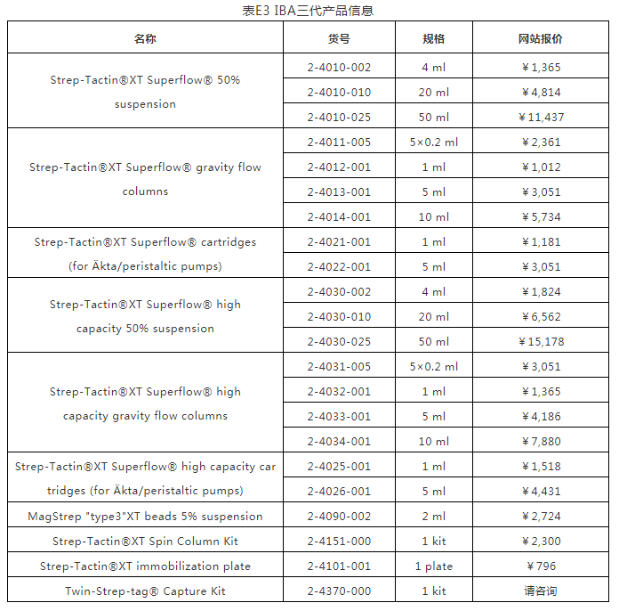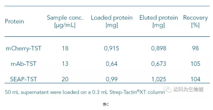 因Strep-Tactin?XT與Twin-Strep-tag蛋白的高親和力,即使目標(biāo)蛋白的濃度低,使用Strep-Tactin?XT仍可以有效的捕捉上清中的目標(biāo)蛋白。表C整理了幾個實驗的數(shù)據(jù),顯示當(dāng)目標(biāo)蛋白濃度低于20μg/ml時,得率仍能達到幾近100%。