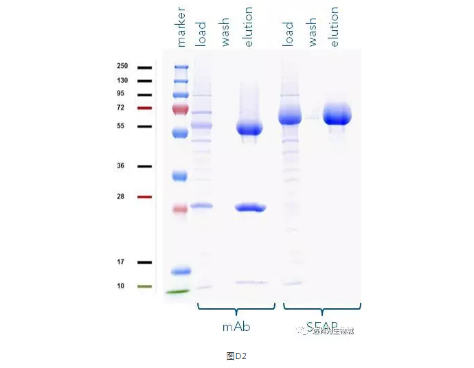 除了上述實驗所用的CHO細胞株外(中國倉鼠卵巢細胞),另一常用于生產(chǎn)蛋白的哺乳動物細胞株為HEK293(人胚胎腎細胞),使用上較CHO簡單。我們測試了Strep-Tactin?XT的純化表現(xiàn):表D1為以Expi293表達SEAP-TST或mAb-TST蛋白后,目標(biāo)蛋白的濃度。圖D2為純化表現(xiàn)的SDS-PAGE分析。從中可知,與ExpiCHO培養(yǎng)基相同,直接將表達好的Expi293上清加入1ml Strep-Tactin?XT高載量重力柱中進行純化,一樣能夠快速的得到高純度的目標(biāo)蛋白。