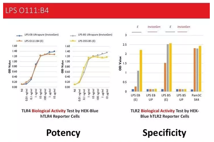 比較InvivoGen和E品牌TLR4特異性LPS(Utrapure)發現,E品牌雖然號稱TLR4 specific agonist,但是可同時激活TLR2和TLR4,而InvivoGen的Ultrapure LPS只能特異性激活TLR4。