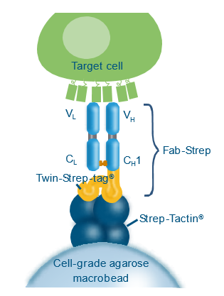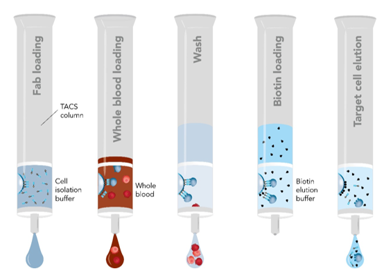 Fab-TACS柱子填充了包被有Strep-Tactin多聚體的細胞級瓊脂糖基質,偶聯上Strep-tagFab片段(Fab-Streps)特異性的結合到瓊脂糖基質上。隨后,加入全血或其他血液制劑流過柱子。目的細胞通過特異性的與Fab-Streps作用從而結合到瓊脂糖基質上,其他非目的細胞則有效的被洗去。最后,加入生物素使目的細胞從Fab-Streps上解離。至此,就已分離得到不帶任何標記的、真實的目的細胞可用于下游的實驗研究。