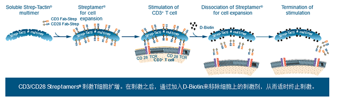 Streptamers?應用于T細胞擴增是目前T細胞擴增術中一項較新穎的技術。該技術的核心在于:將抗CD3和抗CD28Fab-Streps結合到Strep-Tactin多聚體上,使它們形成可溶性的蛋白復合物。在刺激之后,通過加入D-Biotin來移除細胞上的刺激劑,從而適時終止刺激。