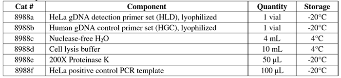 引物不含非特異性擴增。每個引物組均已經通過PCR和凝膠電泳驗證了擴增特異性。該試劑盒靈敏度高,可以檢測低至20個 HeLa細胞/百萬細胞。