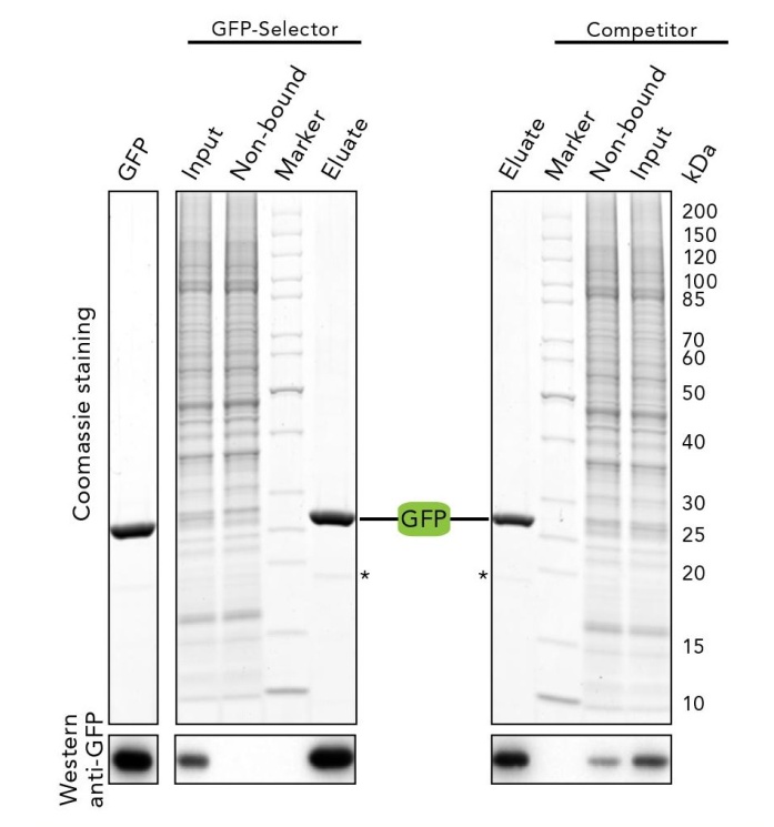 將相同體積的GFP selector和競爭產品分別與不含任何GFP標記蛋白的HeLa裂解物一起孵育,洗滌后,產物通過SDS-PAGE分離并進行銀染色分析。