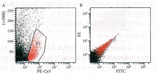 PE-Cy5通道(通常是FL3,接收的熒光波長范圍大致為655-685nm)有時可用于識別死細胞,但首先該通道必須是閑置的通道,及樣本細胞中沒有標記該通道代表的熒光素(PE-Cy5、PerCP等)偶聯抗體。選擇PE-Cy5-SSC散點圖,一般可看到不成群的PE-Cy5陽性細胞,這些陽性細胞的SSC值也是散在分布的,這些散在的PE-Cy5通道非標記陽性細胞,即圖2-A中的紅色部分,將這部分細胞設門顯示于FITC-PE散點圖中,如圖2-B所示,這部分PE-Cy5通道非標記陽性細胞基本都位于對角線部分,而對角線細胞一般為死細胞,所以散在的PE-Cy5通道非標記陽性細胞一般就是死細胞。