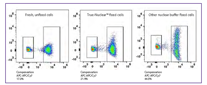 左圖:human PBMC刺激完當(dāng)天染色后上機(jī)檢測;右圖:同一樣本,表染和固定后,保存在Cyto-Last? buffer里面,14天后做胞內(nèi)染色并上機(jī)。