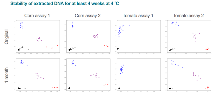 △圖2. 用QuickExtract從玉米和番茄中提取的DNA用KASP基因分型技術(shù)進行聚類(Original),然后在4℃下儲存1個月,再將樣品進行聚類(1month) ,實驗結(jié)果完全一致。