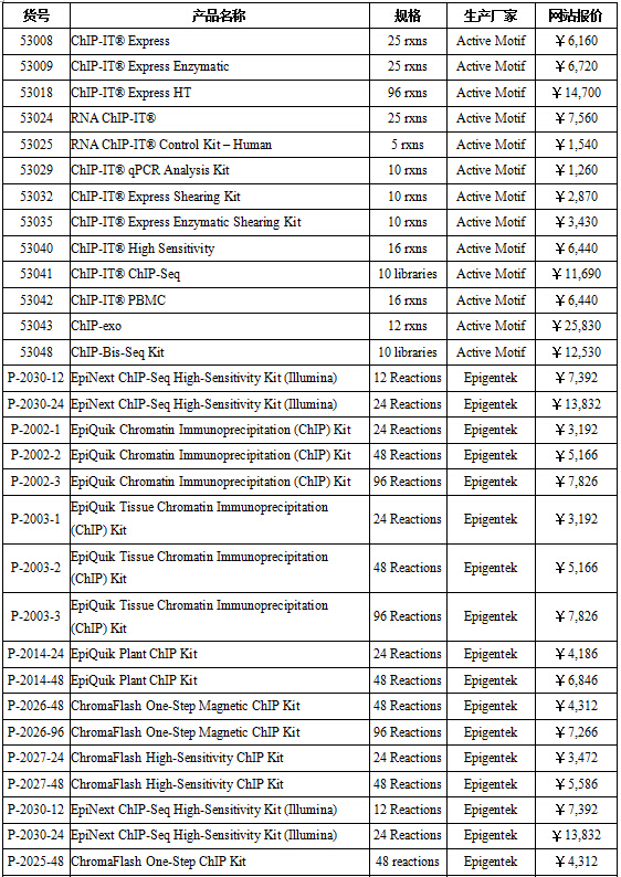 染色體免疫共沉淀( Chromatin Immunoprecipitation , ChIP )是基于體內分析發展起來的方法,也稱結合位點分析法,它能真實、完整地反映結合在DNA序列上的調控蛋白,是目前確定與特定蛋白結合的基因組區域或確定與特定基因組區域結合的蛋白質的好方法,這項技術幫助研究者判斷在細胞核中基因組的某一特定位置會出現何種組蛋白修飾。ChIP技術和芯片技術的結合有利于確定全基因組范圍內染色體蛋白的分布模式以及組蛋白修飾情況。該技術主要應用于:1.組蛋白修飾研究 2.轉錄調控分析 3.藥物開發研究 4.有絲分裂研究 5.DNA損失與凋亡分析。
